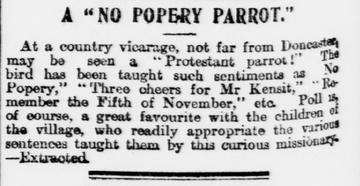 Although much of the legal framework discriminating against English Catholics had been removed by the early nineteenth century, anti-Catholicism remained a ubiquitous cultural force in Victorian Britain. In fact, anti-papal attitudes were given new impetus in 1850 with the papal re-establishment of the Roman Catholic hierarchy in Britain (an act popularly dubbed ‘the Papal Aggression’). Over the remainder of the century, countless newspaper reports can be found detailing instances of popular anti-popery throughout the country. These ranged from violent protests, such as ‘anti-popery riots’ in late 1860s Birmingham, to rather more unexpected manifestations, such as a report from 1899 of a small country vicarage near Doncaster in which a pet parrot had been taught to spout anti-Catholic slurs!